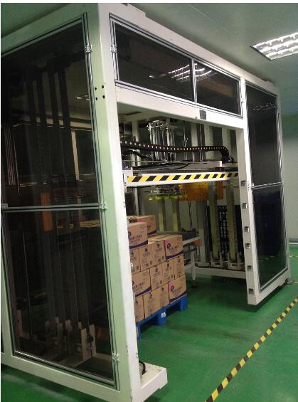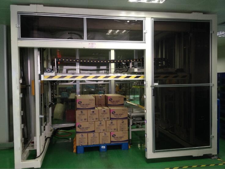 將產(chǎn)品通過進料輸送帶輸送進料,升降機移載著機械手夾具到產(chǎn)品上方,升降機構(gòu)下降抓取產(chǎn)品后平穩(wěn)上升,水平移動到棧板位,按事先輸入的碼垛形式進行產(chǎn)品碼放。碼垛裝置是依靠伺服電機和鏈條傳動來同步運行控制,確保產(chǎn)品碼放位置淮確。