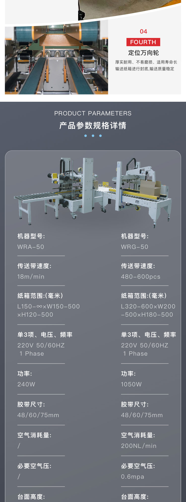 介紹:自動四角邊封箱機WRA-50-WRG-50工型封箱機的成功研發,填補了封箱機在面對特別行業需進行角邊封箱空缺特別是針對與電子產業和需走海運的行業,90°轉角機,氣缸自動推箱;紙箱上下四個角邊同時自動封箱,可與GPA/GPB/GPC機型聯機組合完成工字型封箱機。該款封箱機廣泛應用于食品、日化、電子等行業。 產品別稱:全自動封箱機、工字封箱機、一字封箱機、十字封箱機、四角邊封箱機、上下驅動封箱機、左右驅動封箱機、快遞封箱機、電商封箱機、膠帶封箱機、快速封箱機、可調封箱機、伺服封箱機
