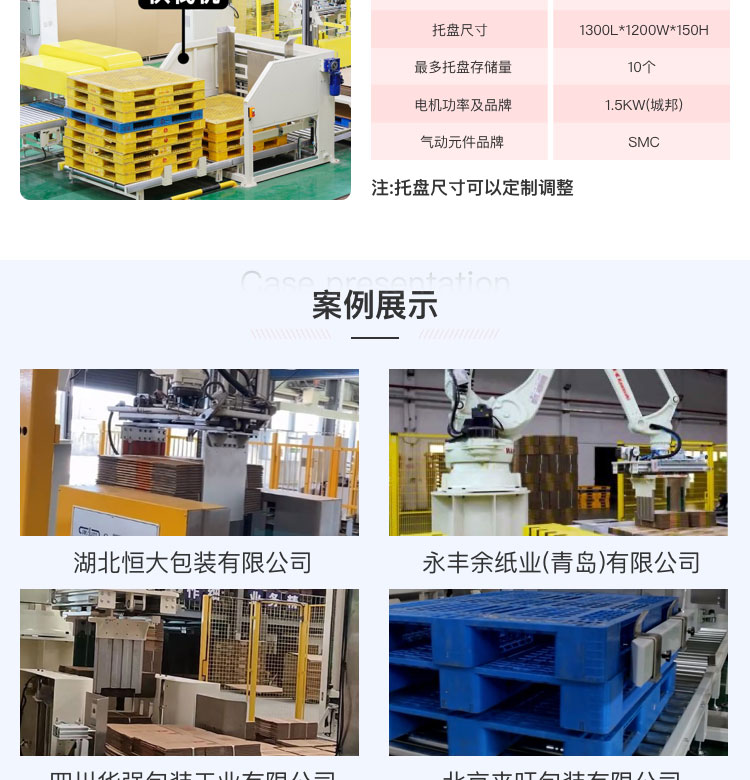 產(chǎn)品簡述:供棧機(jī)則是棧板分離機(jī)結(jié)構(gòu)控制棧板掉落在鏈板輸送線上,分離機(jī)構(gòu)成可根據(jù)棧板不同尺寸自動(dòng)調(diào)整寬度,棧板分離后,經(jīng)由鏈板線輸送至碼垛機(jī)器人處。