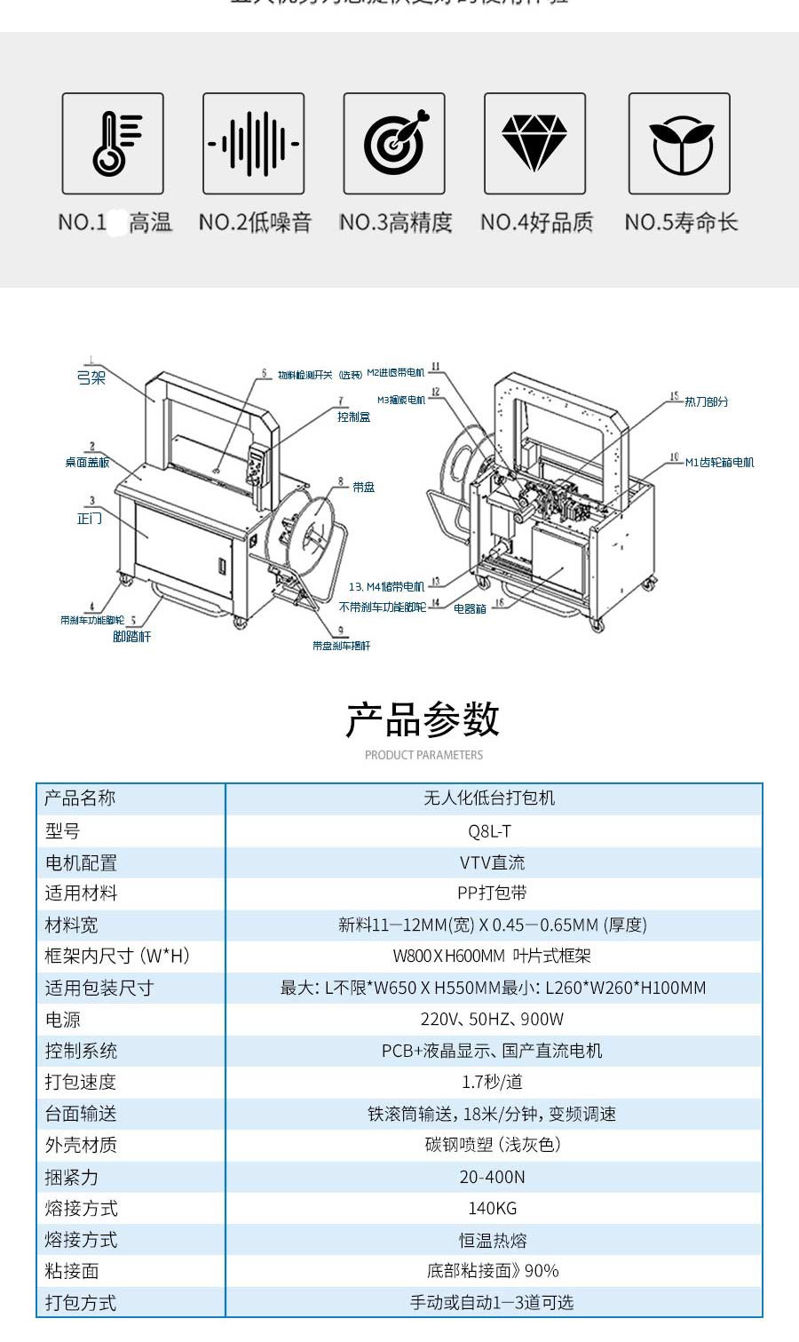 介紹:電機+減速機+凸輪+緊縮臂運作,捆緊力大,故障少,維修方便。 零部件均由電腦微控機床精密加工,機械動作柔和穩(wěn)定,耐久性,功能齊全,使用壽命長。 捆包結(jié)束后電機馬上停止運轉(zhuǎn),省電實用。 保養(yǎng)容易,免加油,機械堅固,操作簡單。 用途廣泛,可單機操作或配合其他機種,設(shè)計自動化與無人化的生產(chǎn)系統(tǒng)。 外型精巧、美觀、節(jié)省空間。 側(cè)式設(shè)計可避免機器接觸到水或其它污染物 打包機不脫帶,自動送帶 ?