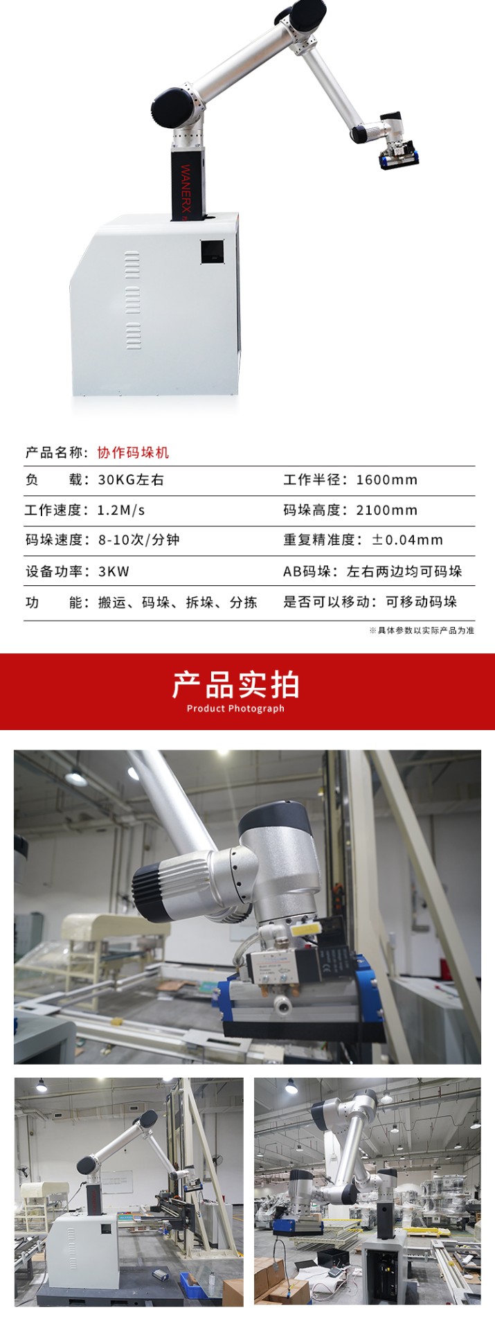 介紹:協作碼垛機器人是智能機器人,與人類工作人員緊密合作,提高生產效率、靈活適應不同任務。配備傳感器,能自主學習、感知環境。廣泛應用于紙箱、醫藥、食品等多個行業生產線。革命性提高生產線智能化程度,為工作人員創造更的工作環境。