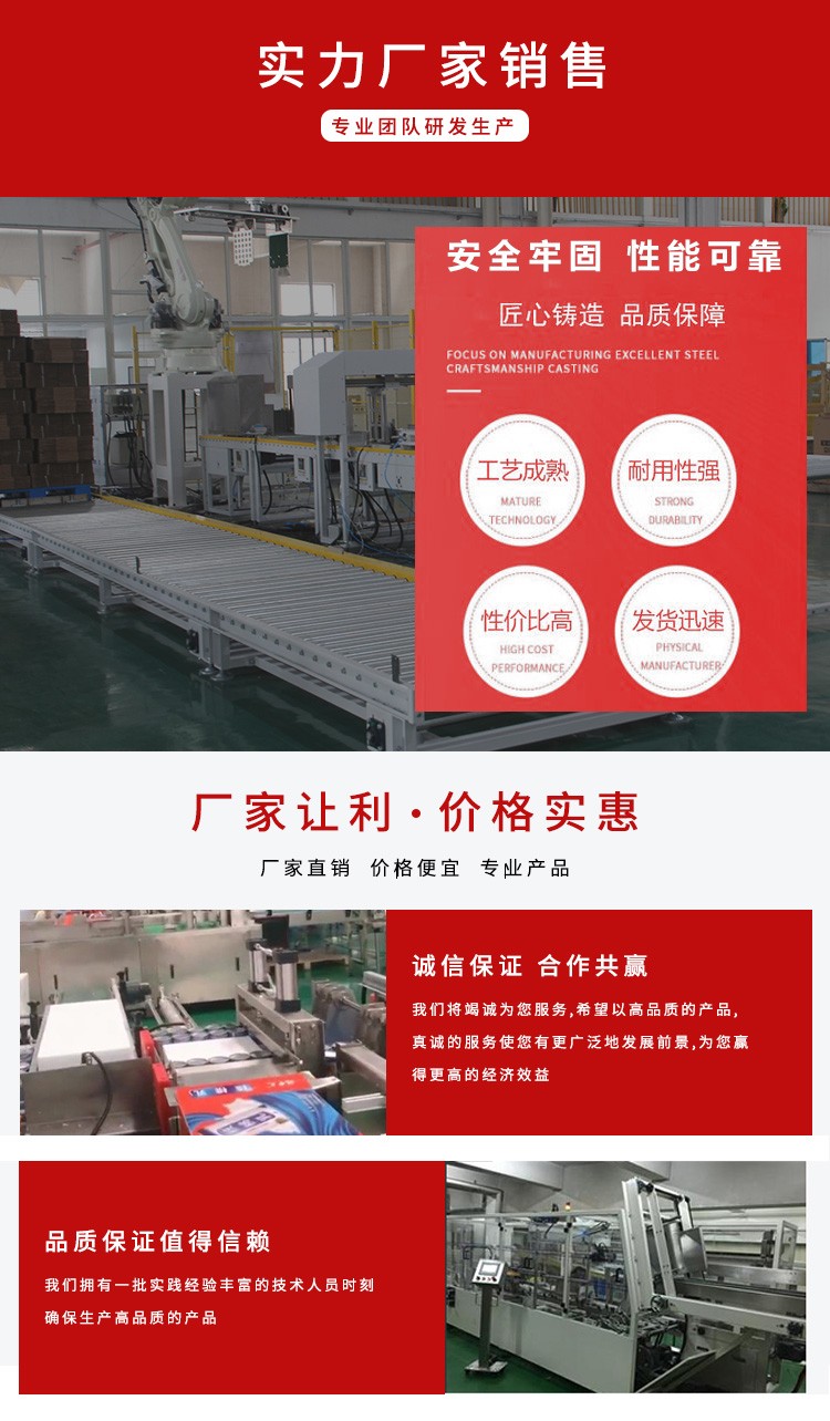大型機械手碼垛機是一種高度智能化的包裝設備,主要由大型機械手臂、先進的控制系統(tǒng)、傳感器和夾具組成。它具備強大的抓取能力和承載能力,可以自動地完成大規(guī)模產(chǎn)品的抓取、碼垛和放置任務。大型機械手碼垛機通常應用于高產(chǎn)、大批量生產(chǎn)的生產(chǎn)線,可以顯著提升生產(chǎn)效率,降低人力成本,同時保證產(chǎn)品的穩(wěn)定性和包裝質(zhì)量的一致性。這種機器人碼垛機廣泛應用于各行各業(yè),如物流、汽車、電子、建材等領域,為企業(yè)實現(xiàn)智能化、自動化生產(chǎn)提供了有力支持。其先進的技術和靈活性,使其成為現(xiàn)代化生產(chǎn)線不可或缺的重要設備。